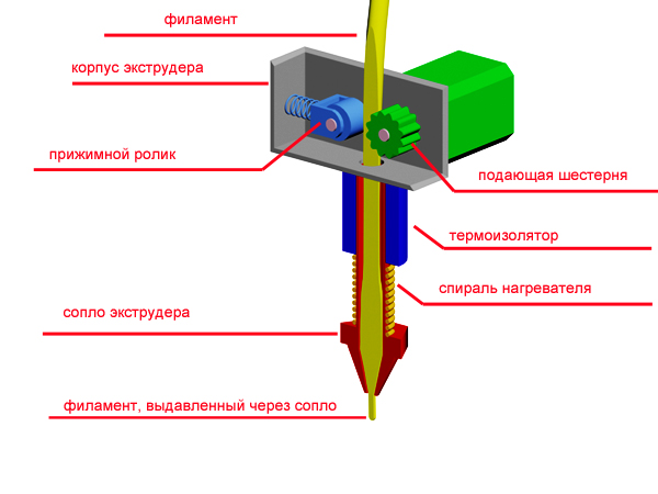 Экструдер отвечает за подачу и плавление пластика. Он включает: