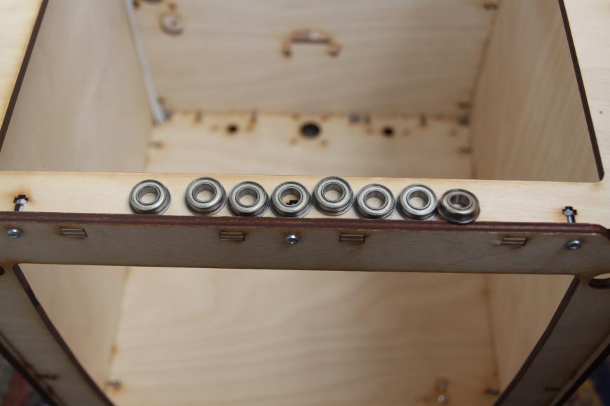 Раздвигаем шпули с шайбами по сторонам в упор до подшипников, ровняем каретки относительно друг друга, затягиваем винты на шпулях.