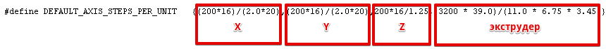 Теперь посмотрим, как я их получил. По всем осям стоят шаговые двигатели 200 шагов на оборот, 16 микрошагов на шаг (устанавливается перемычками на плате). По осям X и Y стоит приводной ремень GT2 с шагом 2 мм и 20-ти зубые шкивы, итого получаем формулу (200*16)/(2.0*20). По оси Z стоят шпильки М8 с шагом резьбы 1,25 мм, итого формула 200*16/1.25.