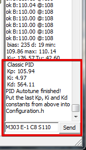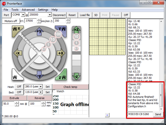 После того, как всё заработает нужно откалибровать PID нагрева хотэнда и стола. Для этого я использую Pronterface. Вводим команду 'M303 E0 C8 S260'. Где M303 - команда калибровки, E0 - хотэнд, C8 - количество циклов нагрева-охлаждения, S260 - типичная температура работы сопла.