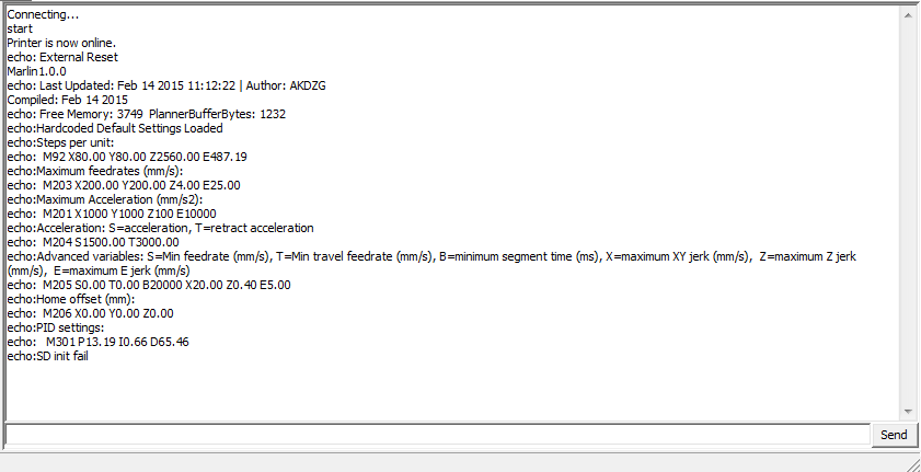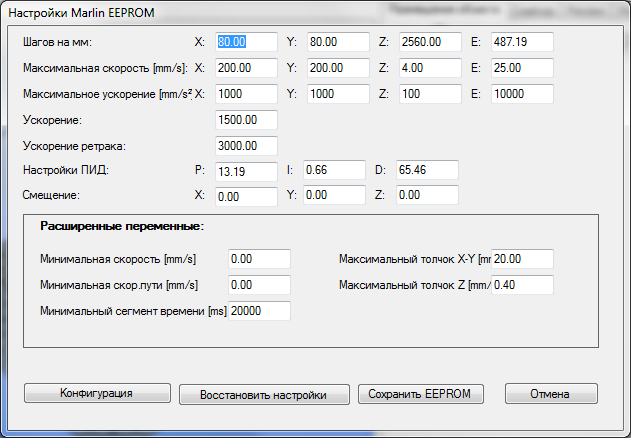Параметры установленные в прошивке можно узнать в программе Repetier-Host через меню КонфигурацияКонфигурация EEPROM. Предварительно нужно указать COM порт в настройках и нажать кнопку 'Подсоединить'.
