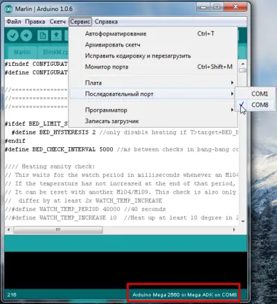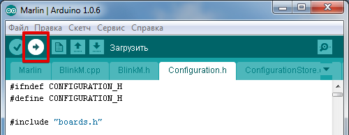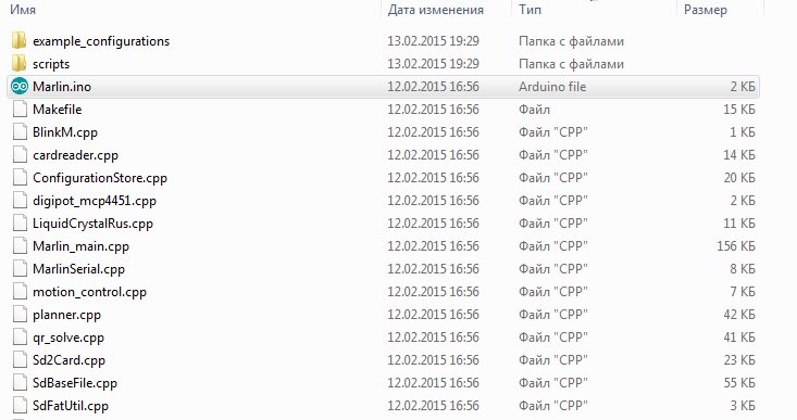 Переходим в папку с прошивкой и запускаем файл Marlin.ino.