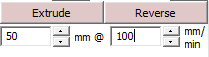 - Экструдер. Extrude - выдавливание нити, Reverse (retract) - откат, втягивание нити.