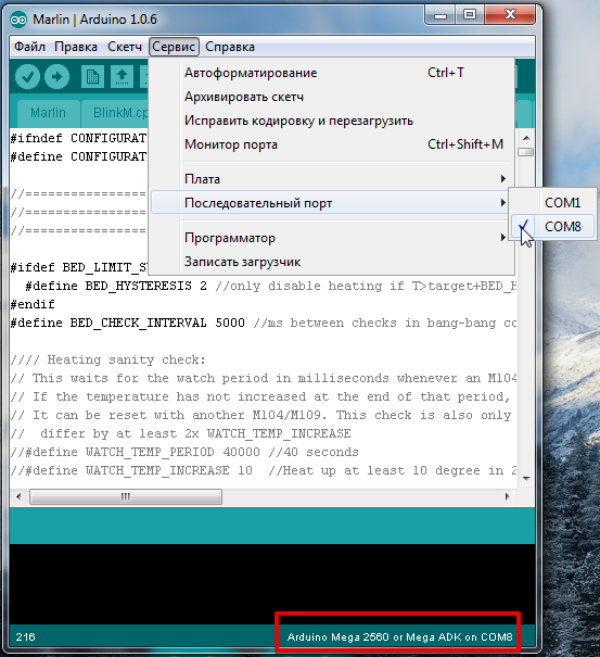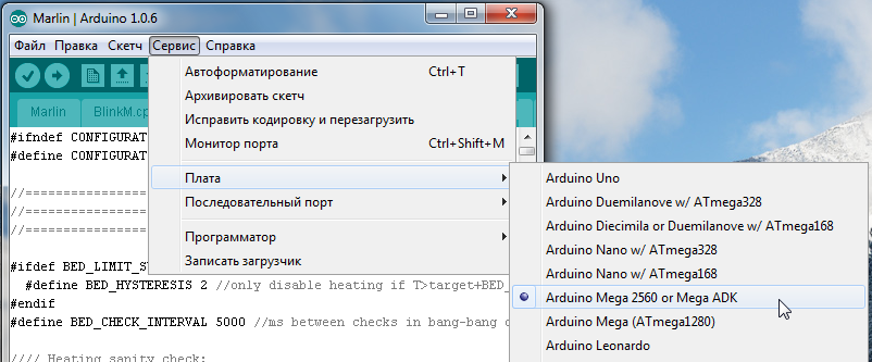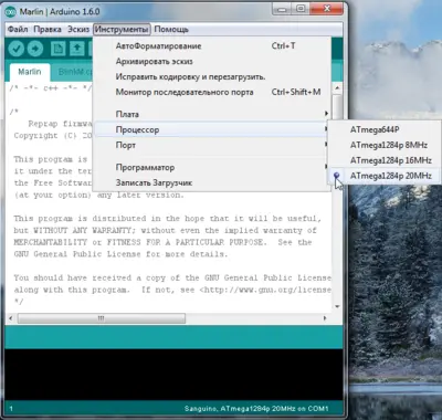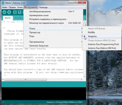 Для выбора нужной платы в Arduino IDE нужно скопировать с заменой всё из папки с прошивкой 'Marlin-DevelopmentArduinoAddonsArduino_1.5.xhardwaremarlinavr' в папку Arduino IDE 'C:Program Files (x86)Arduinohardwarearduinoavr'. После этого появляется возможность выбрать плату Sanguino (базовая плата для Melzi) и нужный тип процессора. У меня нет платы Melzi, поэтому проверить не могу.