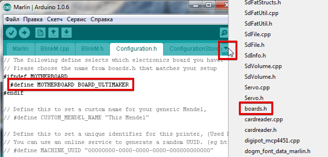 Начнём с выбора контроллера (MOTHERBOARD). Список контроллеров находится во вкладке boards.h. Давим на треугольник в правом верхнем углу и выбираем boards.h.
