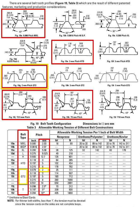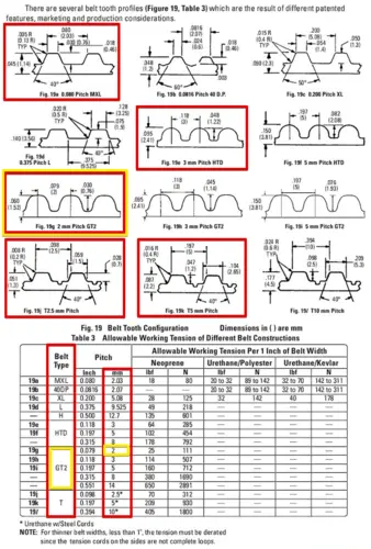 Профили ремней, обычно используемых на 3D принтерах и их шаг. Оригинал здесь, страница 61.