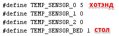 Следующим выбираем датчик температуры - термистор. Видим большой список '//// Temperature sensor settings:'. У меня стоит хотэнд E3D-v5 и китайский термистор на столе. Для E3D-v5 я выбираю '// 5 is 100K thermistor - ATC Semitec 104GT-2', для стола '// 1 is 100k thermistor - best choice for EPCOS 100k'. Если тип термистора неизвестен можно выбрать 1, а если температура не понравится можно выбирать любой и тестировать. Меняю.