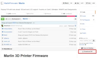 Прошивка лежит по этому адресу. Качаем. Давим на кнопку Download ZIP. Скачивается архив Marlin-Development.zip. Распаковываем его в выбранную папку.