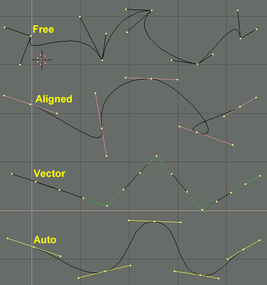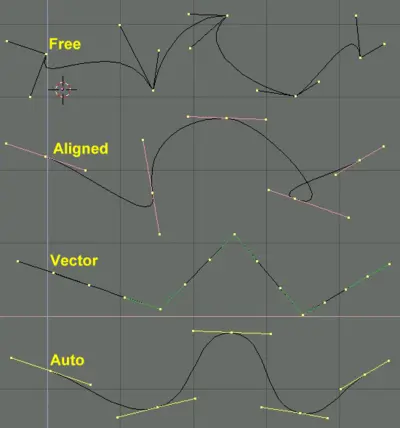 Контрольные точки (vertex) кривой Безье состоят из самой точки и двух ручек (handles) иногда их называют рычагами Безье. Точка в центре позволяет перемещать контрольную точку целиком, перемещение же ручек позволяют менять кривизну линии.