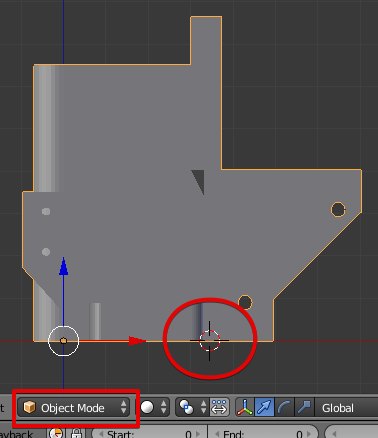 Выходим из режима редактирования, нажимая клавишу Tab на клавиатуре. Нажимаем клавишу 1 на цифровой клавиатуре для просмотра модели сбоку. Видим, что 3D курсор перемещён на нижнюю плоскость.