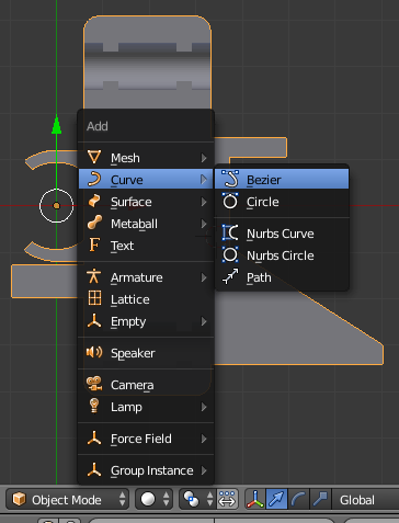 Пришло время рисовать контур вокруг модели. Переключаем на просмотр модели сверху, нажимая клавишу 7 на цифровой клавиатуре. Нажимаем сочетание клавиш Shift+A и добавляем Curve Bezier.