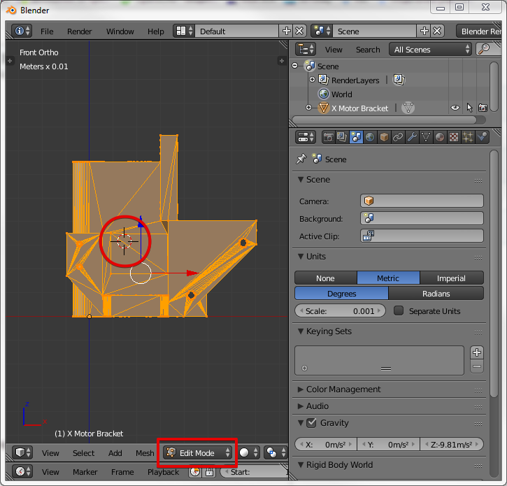 Его нужно перенести на уровень с нижней плоскостью модели по координате Z для начала возведения стенки. Для просмотра модели сбоку нажмём клавишу 1 на цифровой клавиатуре. Перейдём в режим редактирования, нажимаем кнопку Tab на клавиатуре. Режим редактирования индицируется внизу надписью Edit Mode.