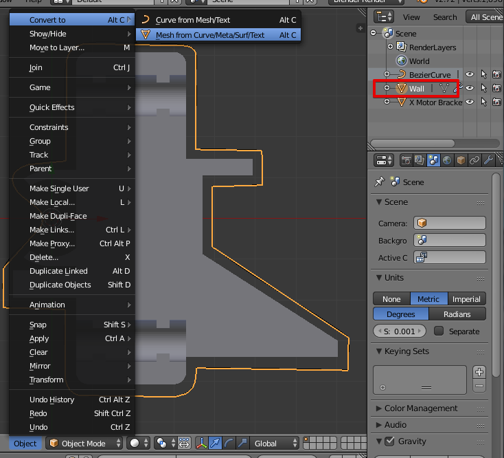 Выйдем из режима редактирования и продублируем созданный контур, сочетание клавиш Shift+D и сразу Enter. Дублируем для возможности вернуться и всё изменить. Копию переименуем в Wall (стенка). Теперь контур Wall нужно преобразовать в Mesh, для возможности экструдирования.