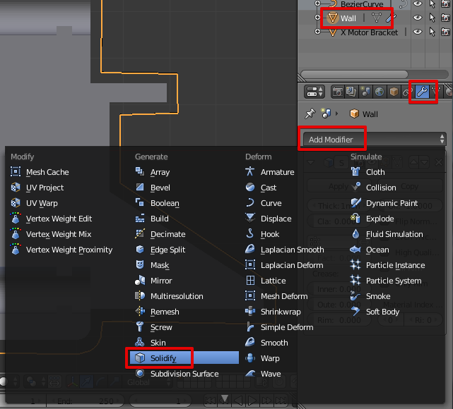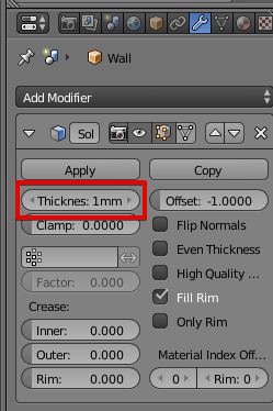Теперь объекту Wall добавим модификатор Solidify (Толщина).
