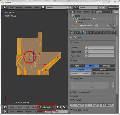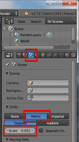 В правой панели нажимаем пиктограмму Scene. Выбираем метрическую систему. Изменяем масштаб измерения Scale до 0.001. Теперь можем моделировать в привычных миллиметрах.