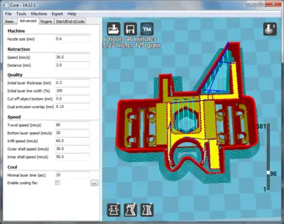 Загружаем модель в Cura и проверяем, печатается ли стенка. Отчётливо видим, что стенка будет (красная линия). Теперь можно поэкспериментировать с толщиной стенки в Blender.